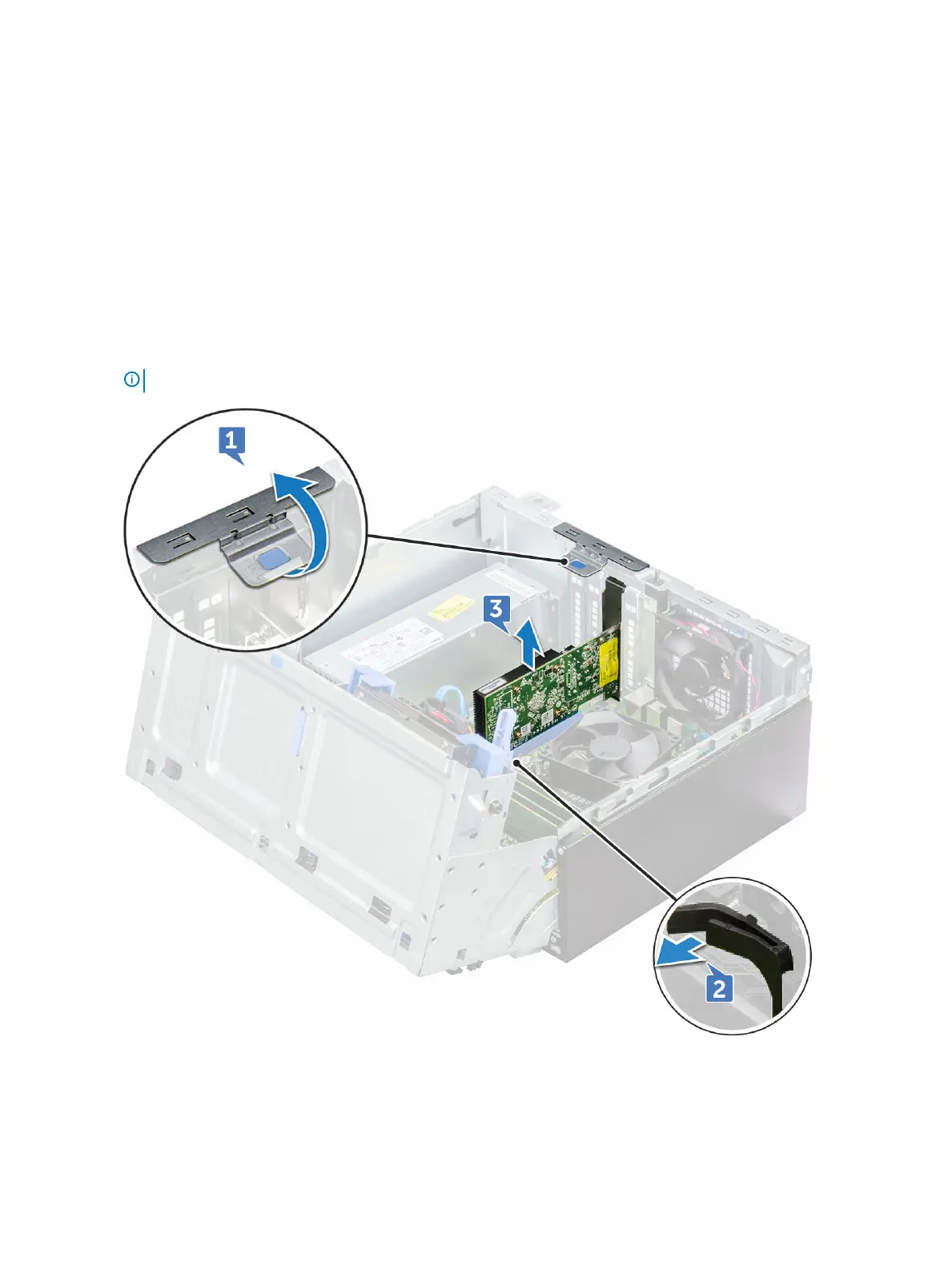 b Push the release tab [2] and lift the PCIe expansion card out of the computer [3].