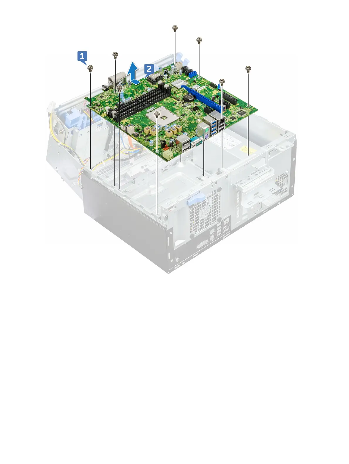 the screw holes on the system board align with the standos on the computer (1).