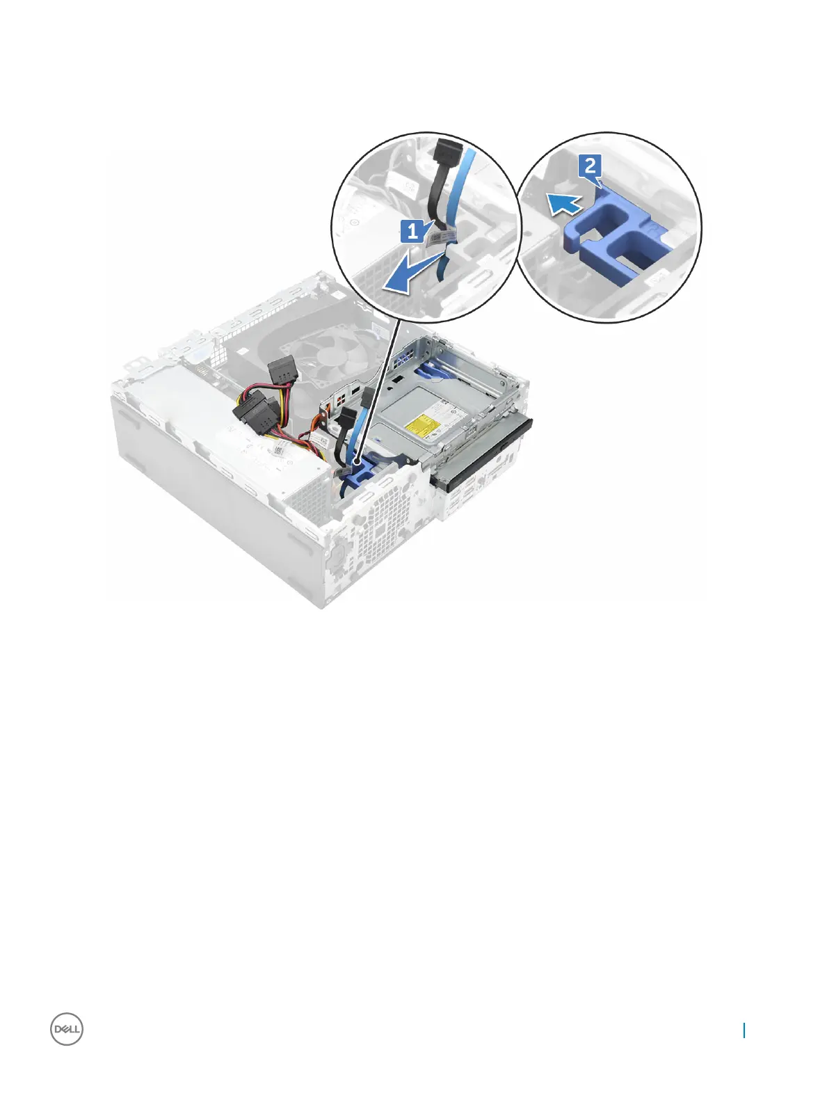 b Holding the tab, disconnect the optical drive cables [2].
