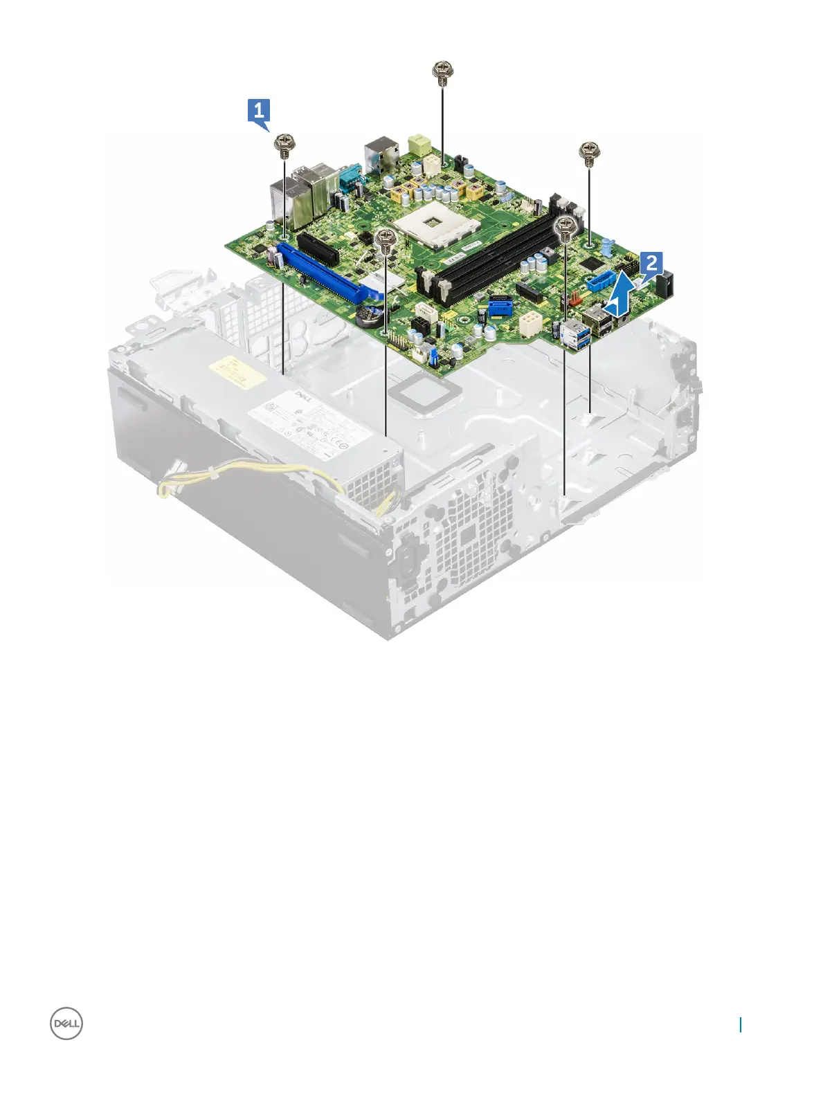 3 Align with the slots on the chassis, and the screw holes on the system board align with the standos on the computer.