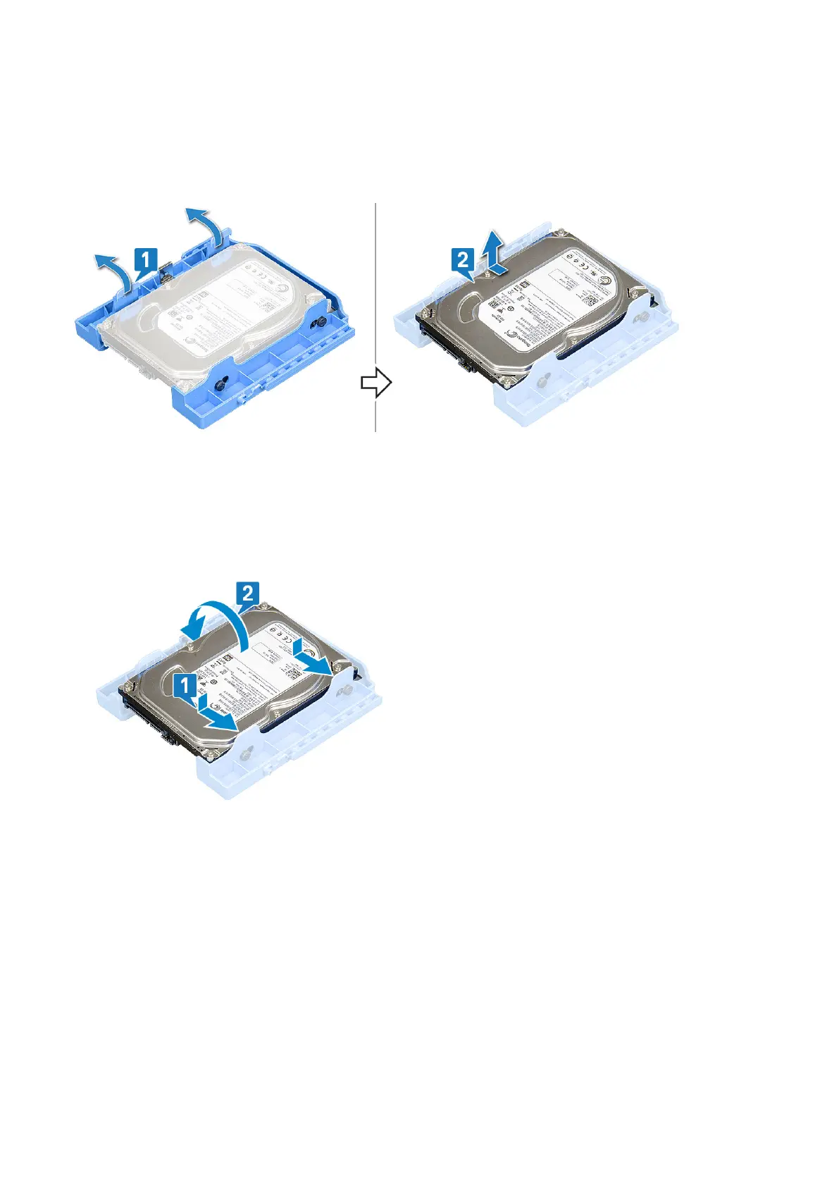 b. Insert the hard drive into the hard drive bracket until it clicks into place [2].