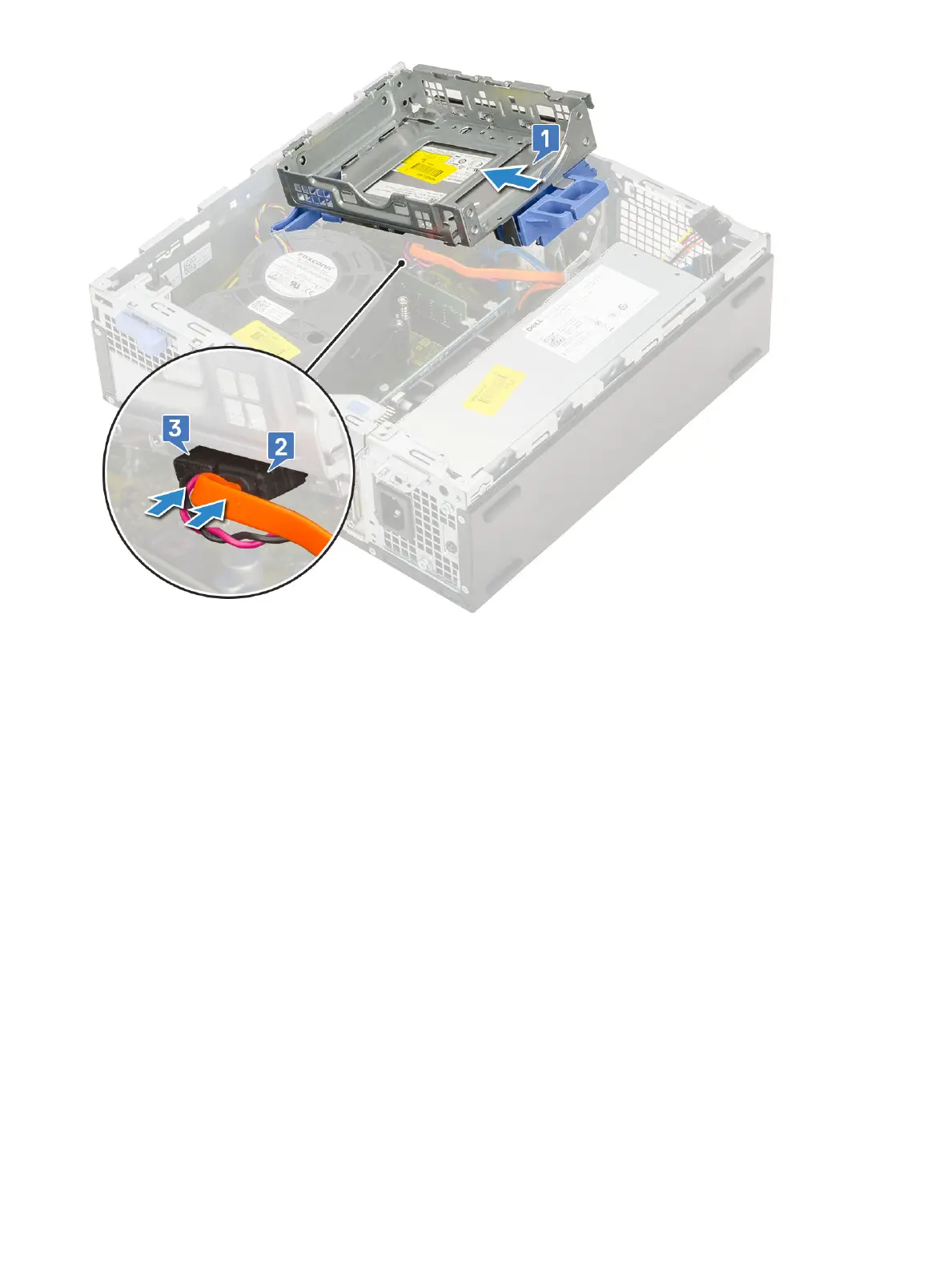 3 Lower the hard drive and optical drive module so that it is placed in its slot [1].