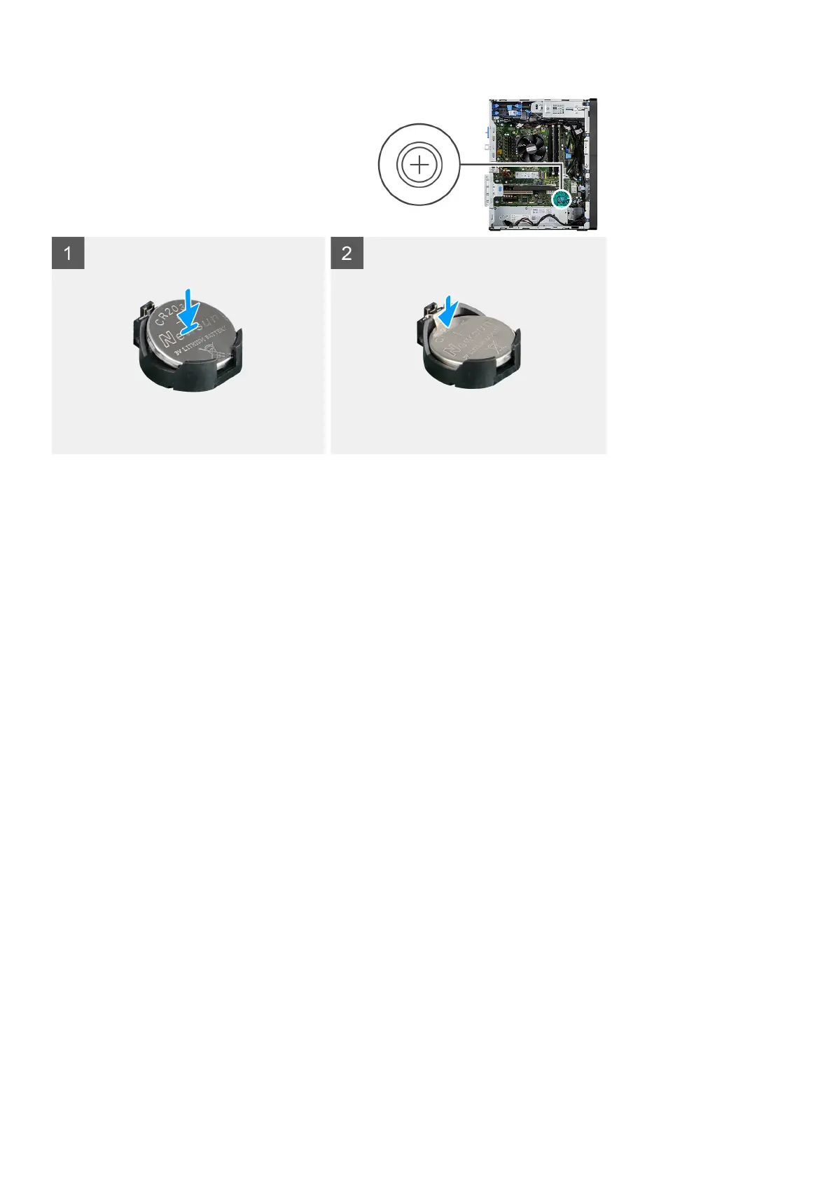 1. Insert the coin cell battery with the "+" sign facing up and slide it under the securing tabs at the positive side of the