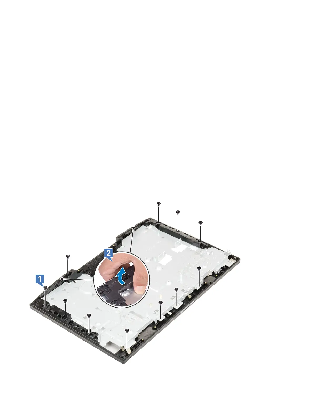 4 Slide and lift to release the tabs on the middle frame from the slots on the display assembly base [2].