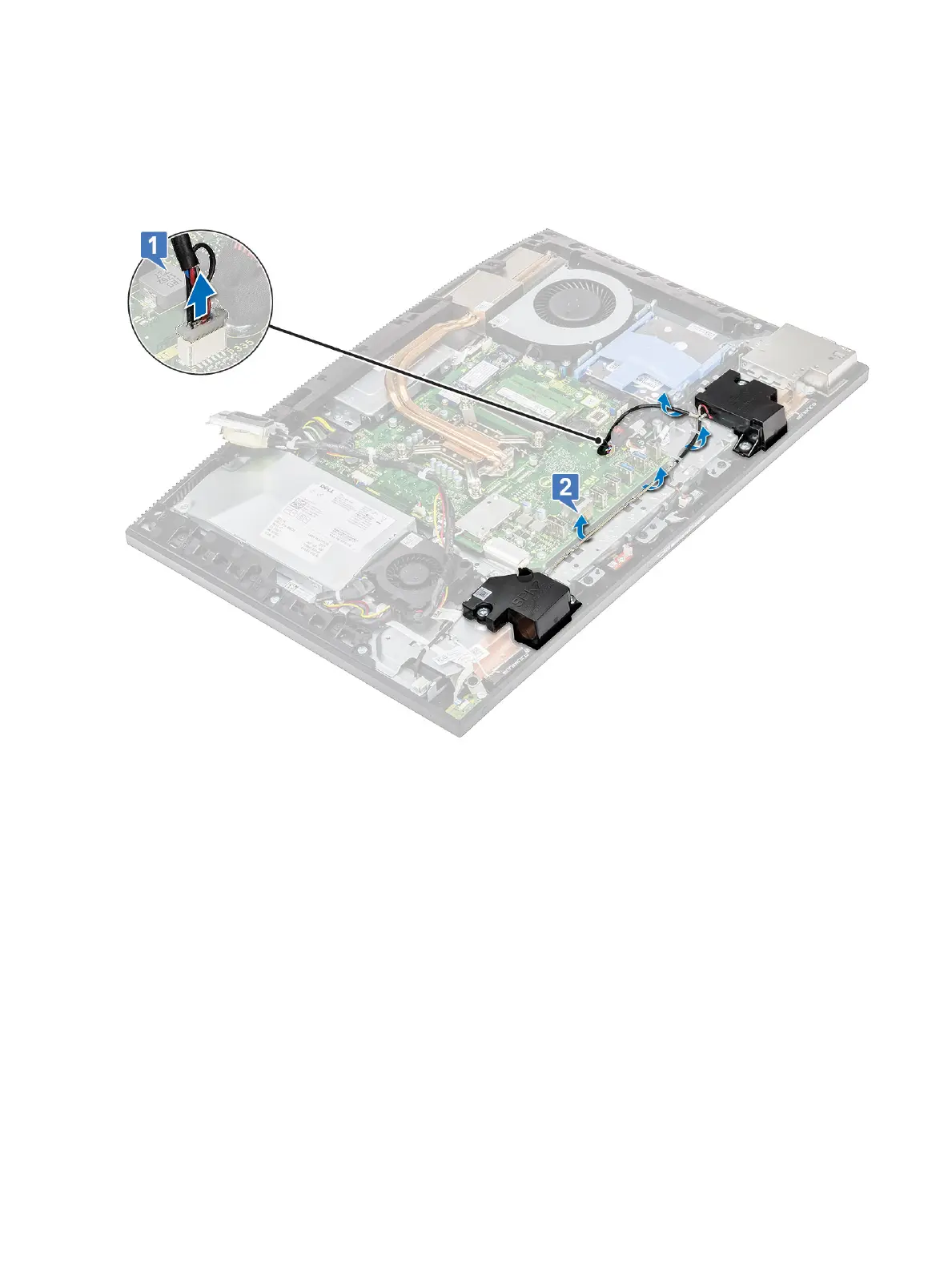 d Lift the speakers and the speaker cable o the display assembly base [2].