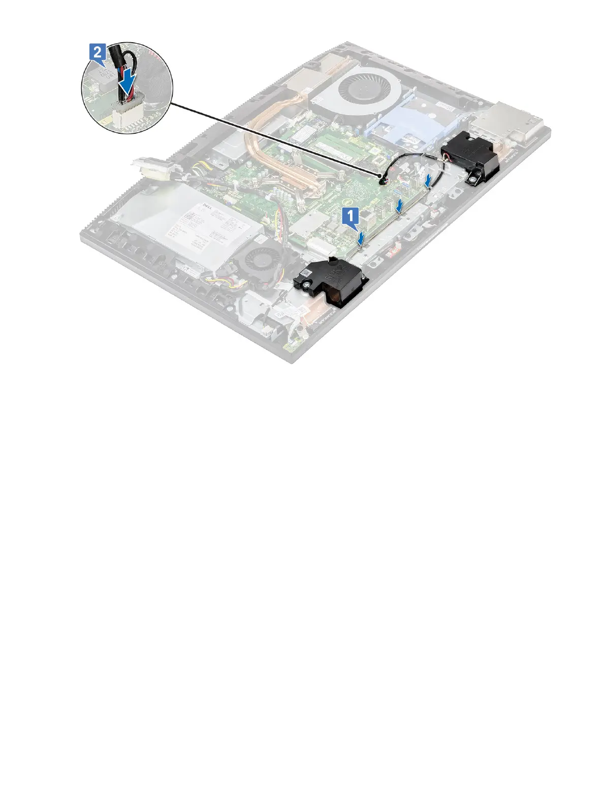 b Slide the power button board cable out from under the antenna cables [2].