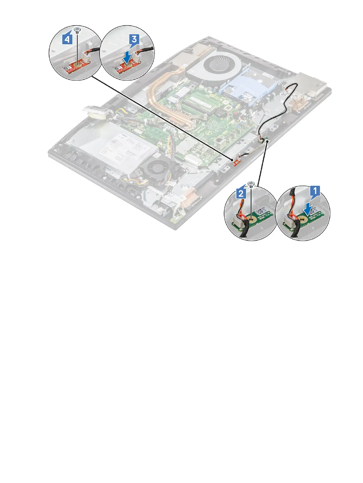 c Route the microphone module cable through the routing guides on the display assembly base [1].