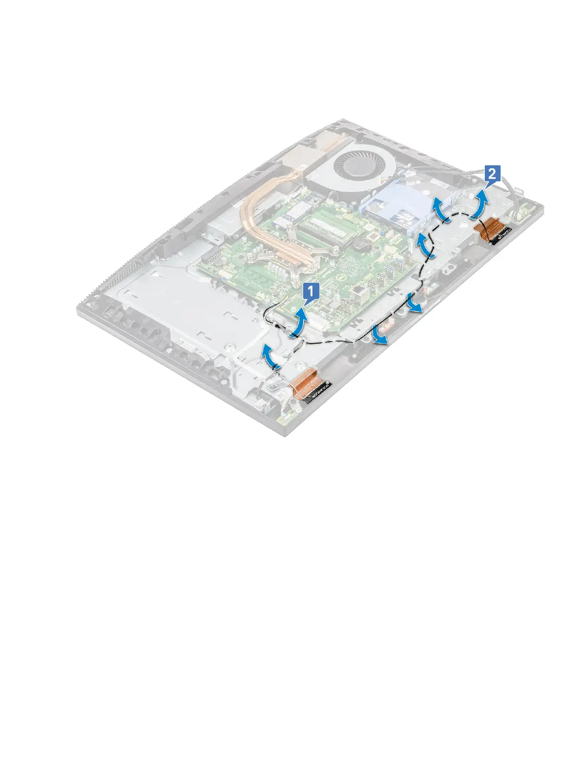 a Remove the antenna cables from the routing guides on the display assembly base [1,2].