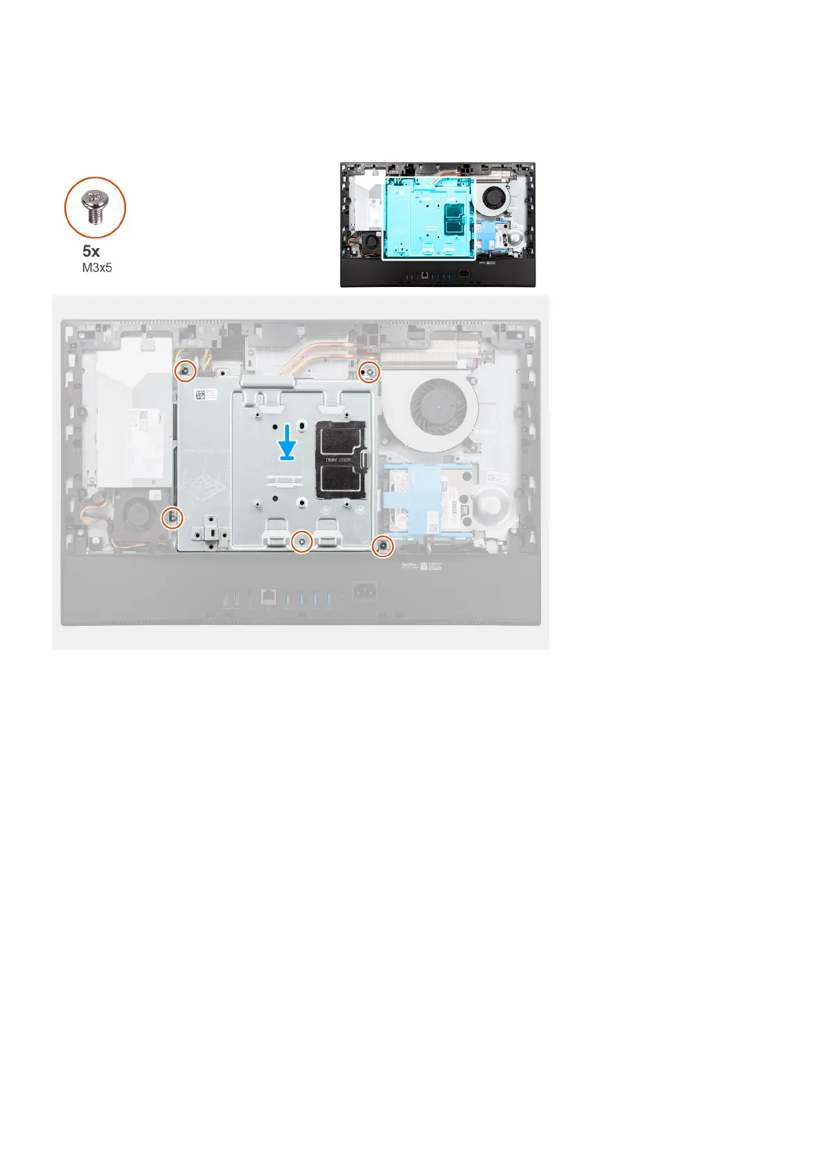 2. Replace the five screws (M3x5) to secure the system-board shield to the display-assembly base.
