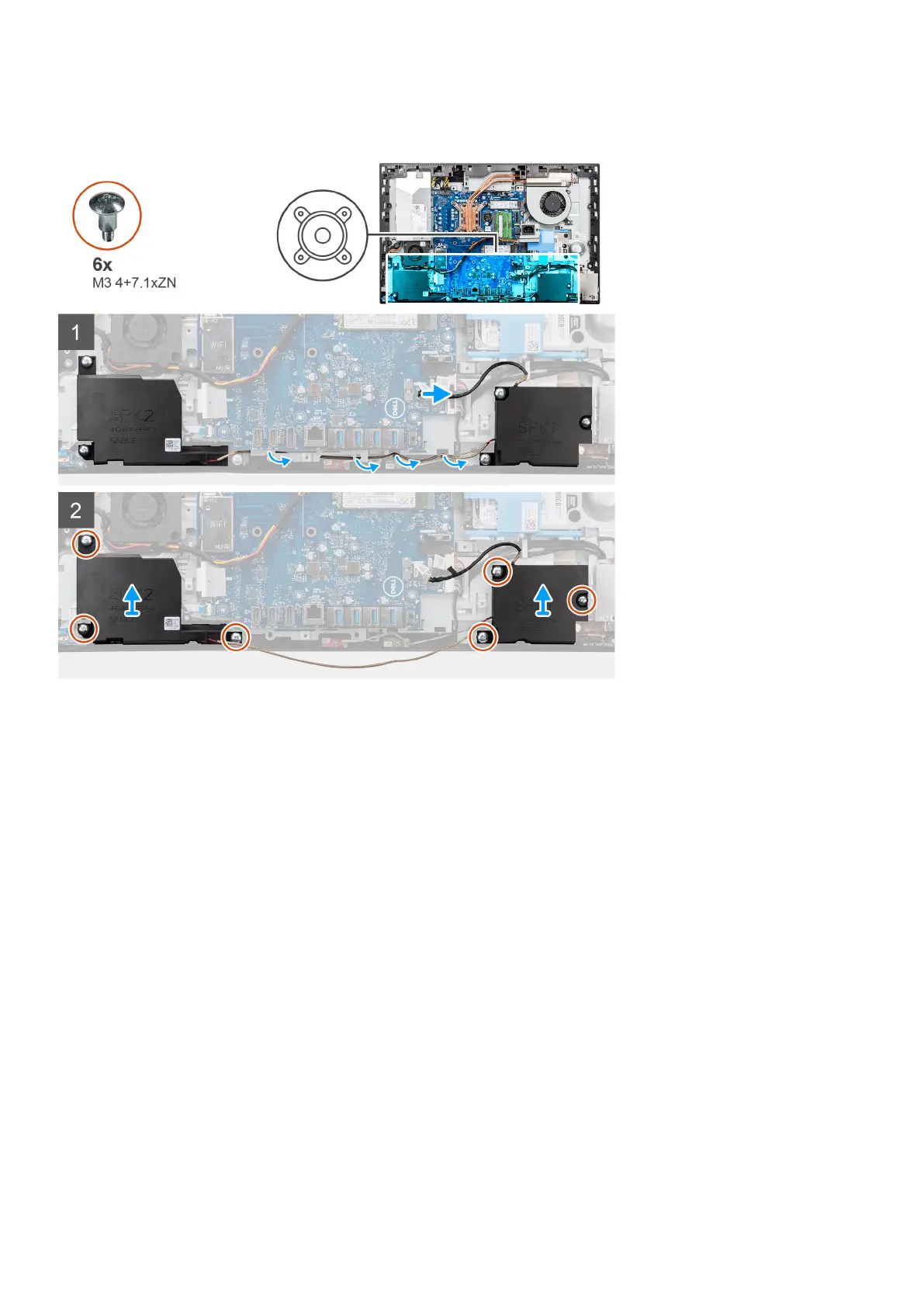 2. Remove the six screws (M3 4+7.1xZN) that secure the speakers to the display-assembly base.