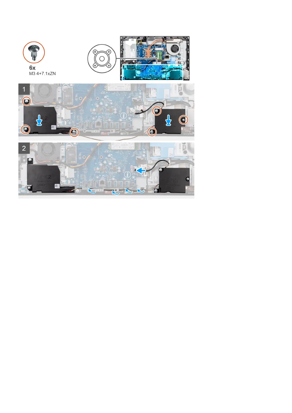2. Replace the six screws (M3 4+7.1xZN) to secure the speakers to the display-assembly base.