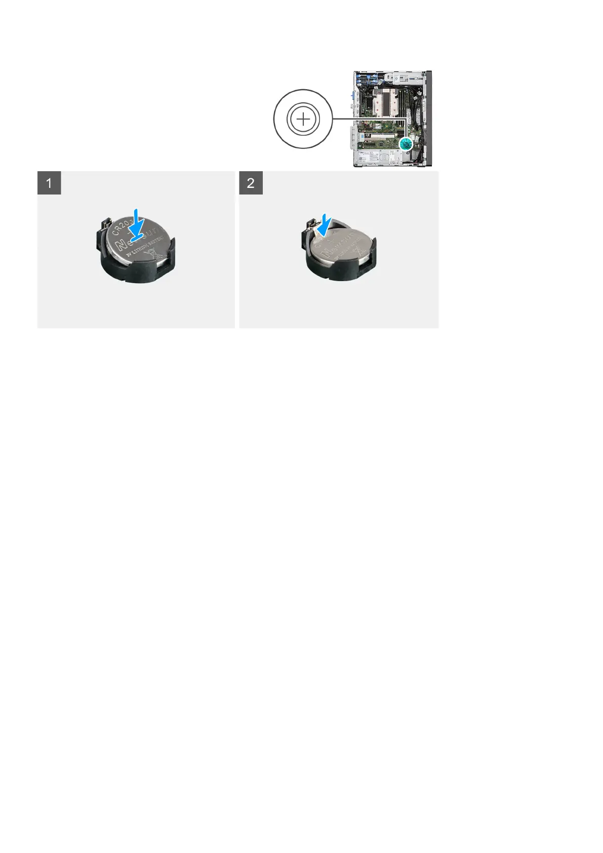 1. Insert the coin-cell battery with the "+" sign facing up and slide it under the securing tabs at the positive side of the