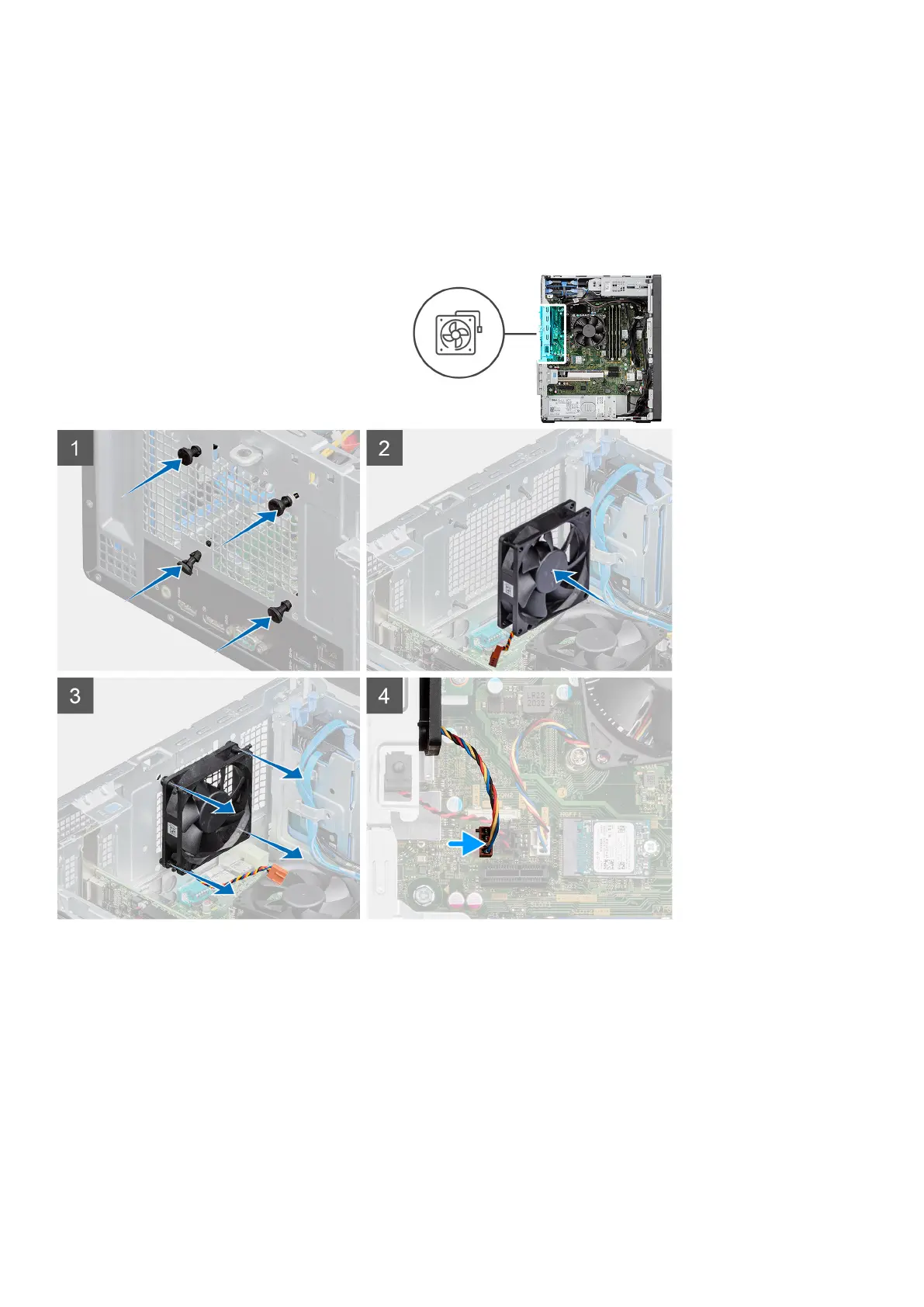 2. Align the slots on the fan with the rubber grommets on the chassis.