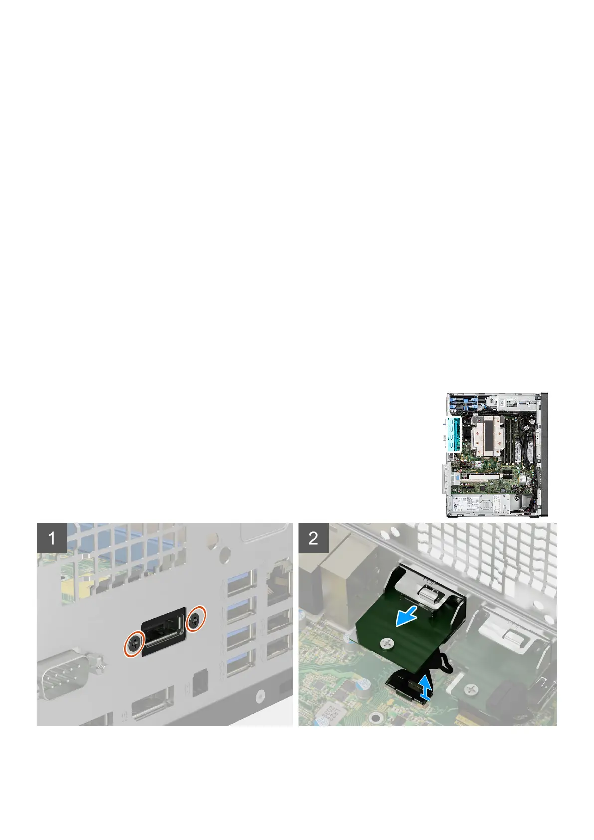 The following images indicate the location of the optional DisplayPort module and provide a visual representation of the removal
