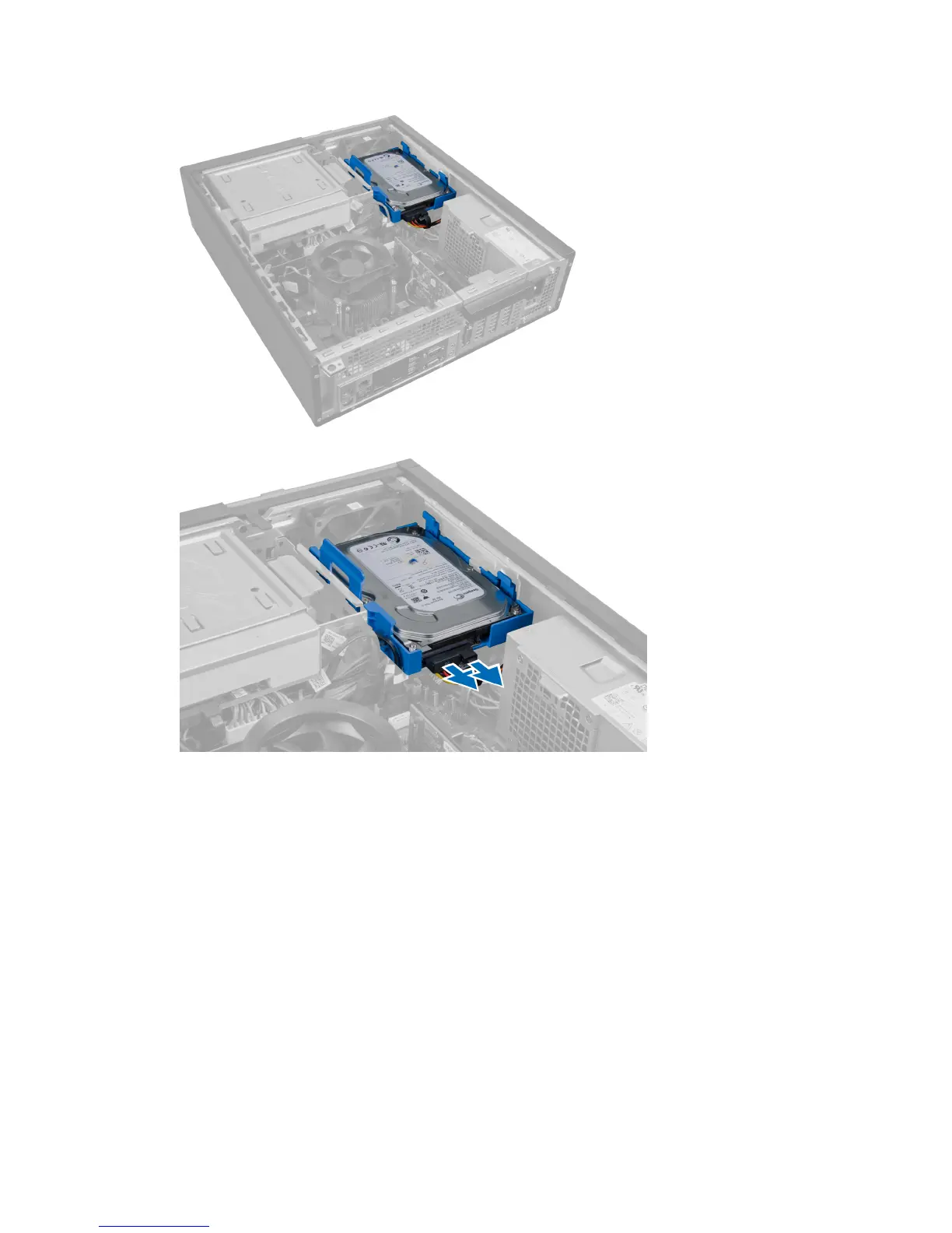 4. Press the blue securing bracket inward and lift the hard drive bracket out of the bay in an angle.