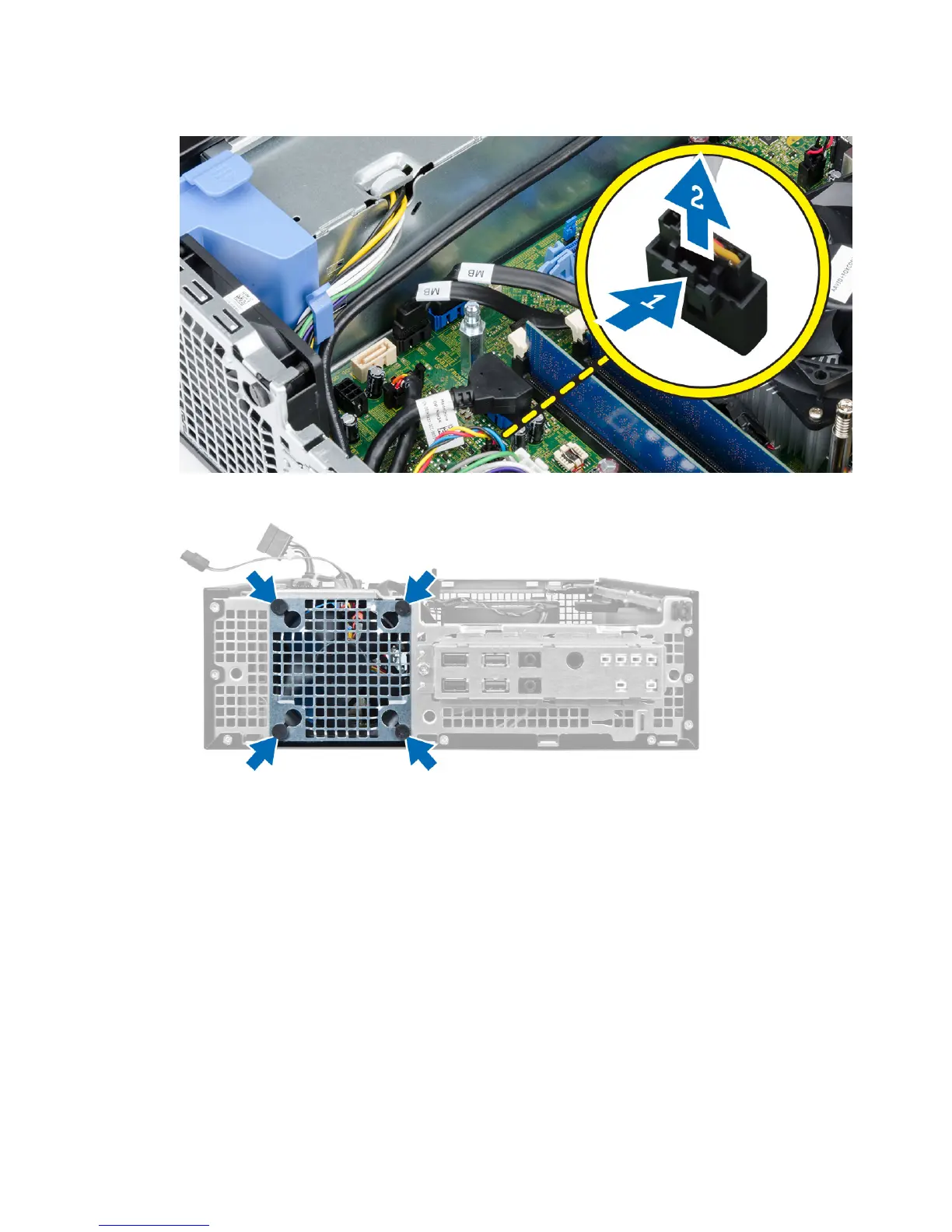 4. Pry and remove the system fan away from the grommets securing it to the front of the computer.