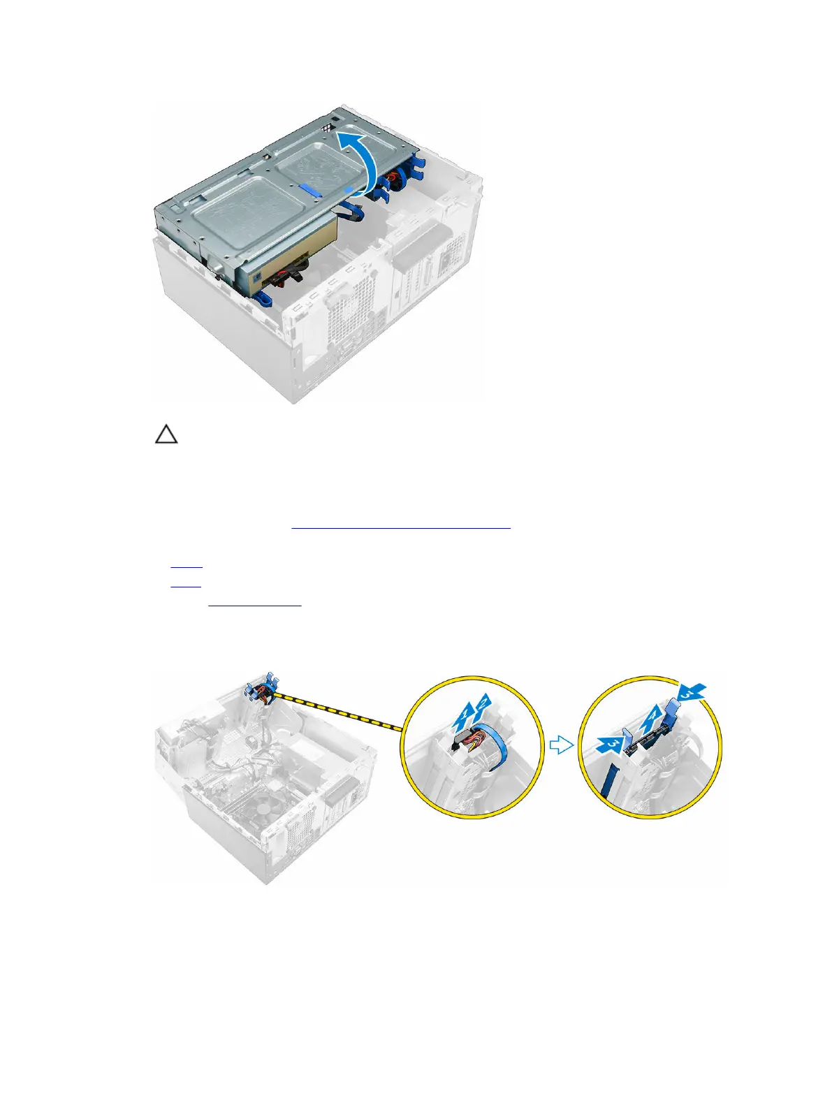 b. Press the blue tabs on both sides [3] and pull the hard drive assembly out of the computer [4].