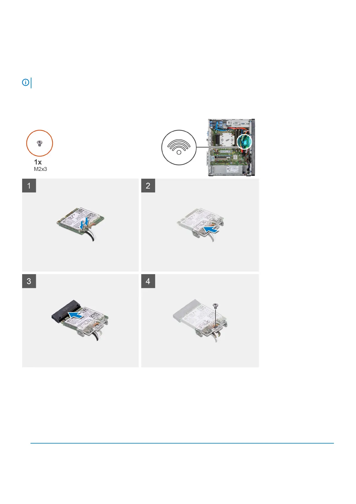 The following images indicate the location of the wireless card and provides a visual representation of the installation procedure.