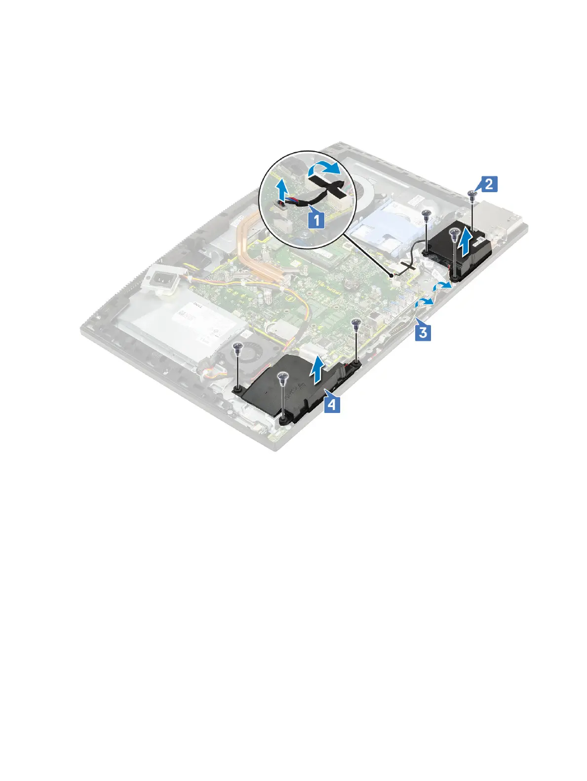 d Lift the speakers and the speaker cable o the display assembly base [3].