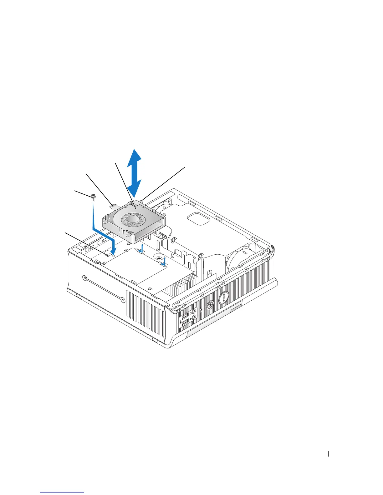 Press down on the fan release tab, and then slide the fan towards the front of the computer so that