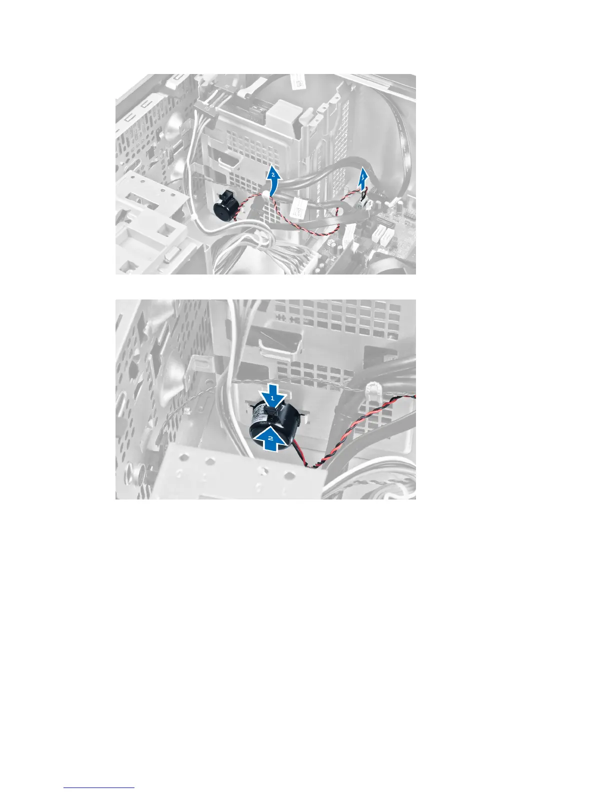 2. Thread the speaker cable into the chassis clip and connect the speaker cable to the system board.