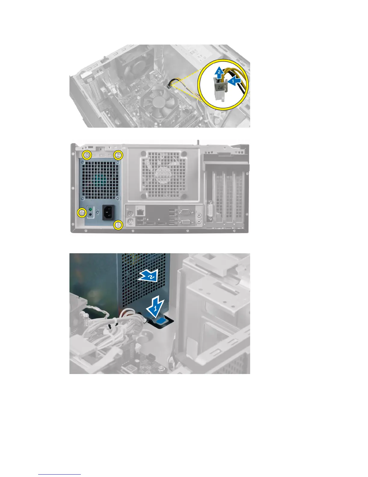 7. Push in on the blue release tab beside the power supply, and slide the power supply towards the front of the