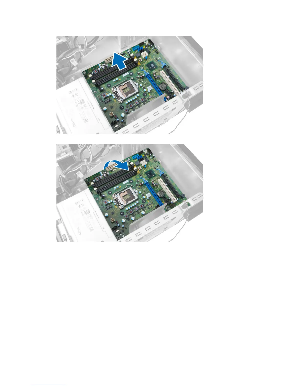 6. Carefully tilt the system board to 45–degrees, and then lift the system board out of the computer.
