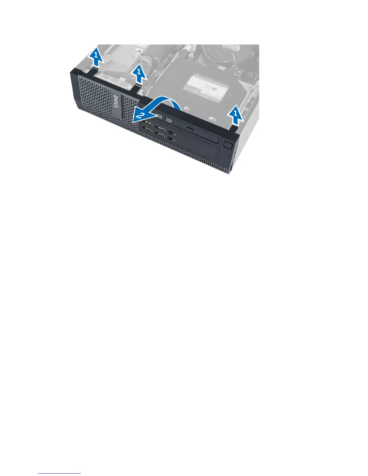 1. Insert the hooks along the bottom edge of the front bezel into the slots on the chassis front.