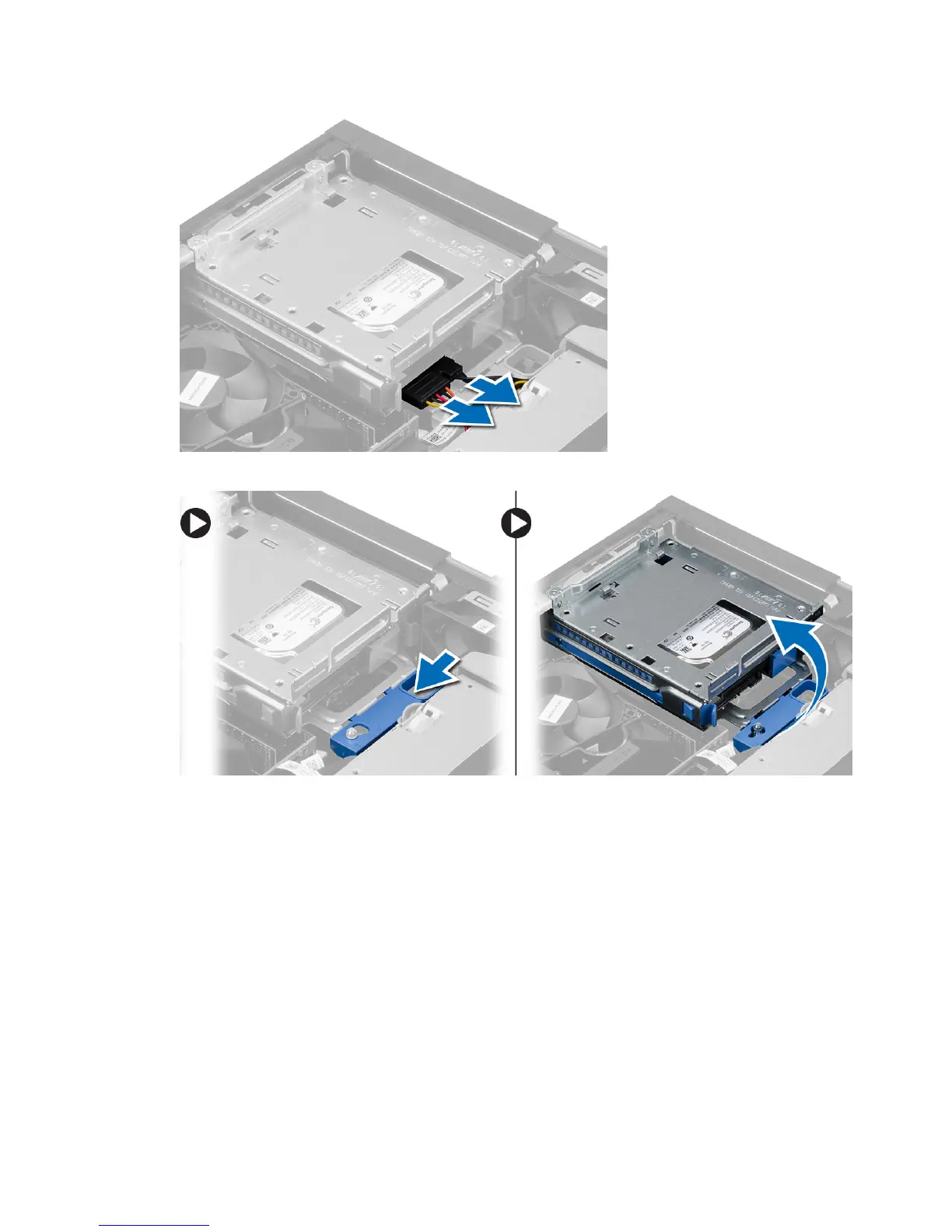 4. Slide the blue drive-cage handle toward unlock position and lift the hard drive cage from the computer.