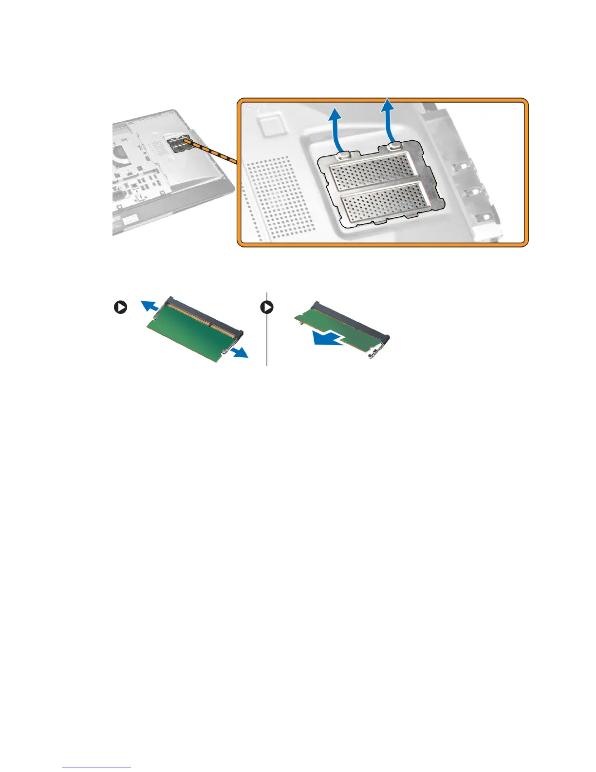 4. Pry the retention clips away from the memory module until it pops-up. Lift and remove the memory