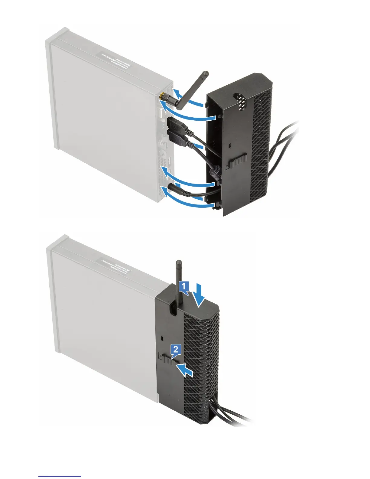 4 Gently press down on the cable cover (1) till it clicks into place and slide the latch (2) to lock the cable cover in place.