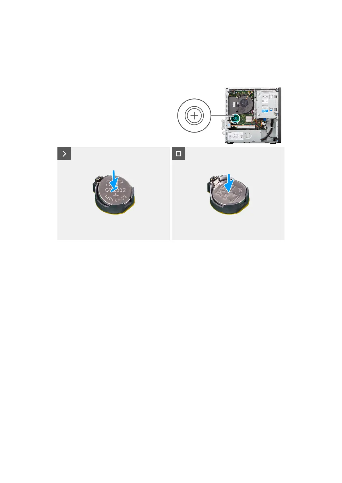 The following images indicate the location of the coin-cell battery and provide a visual representation of the installation