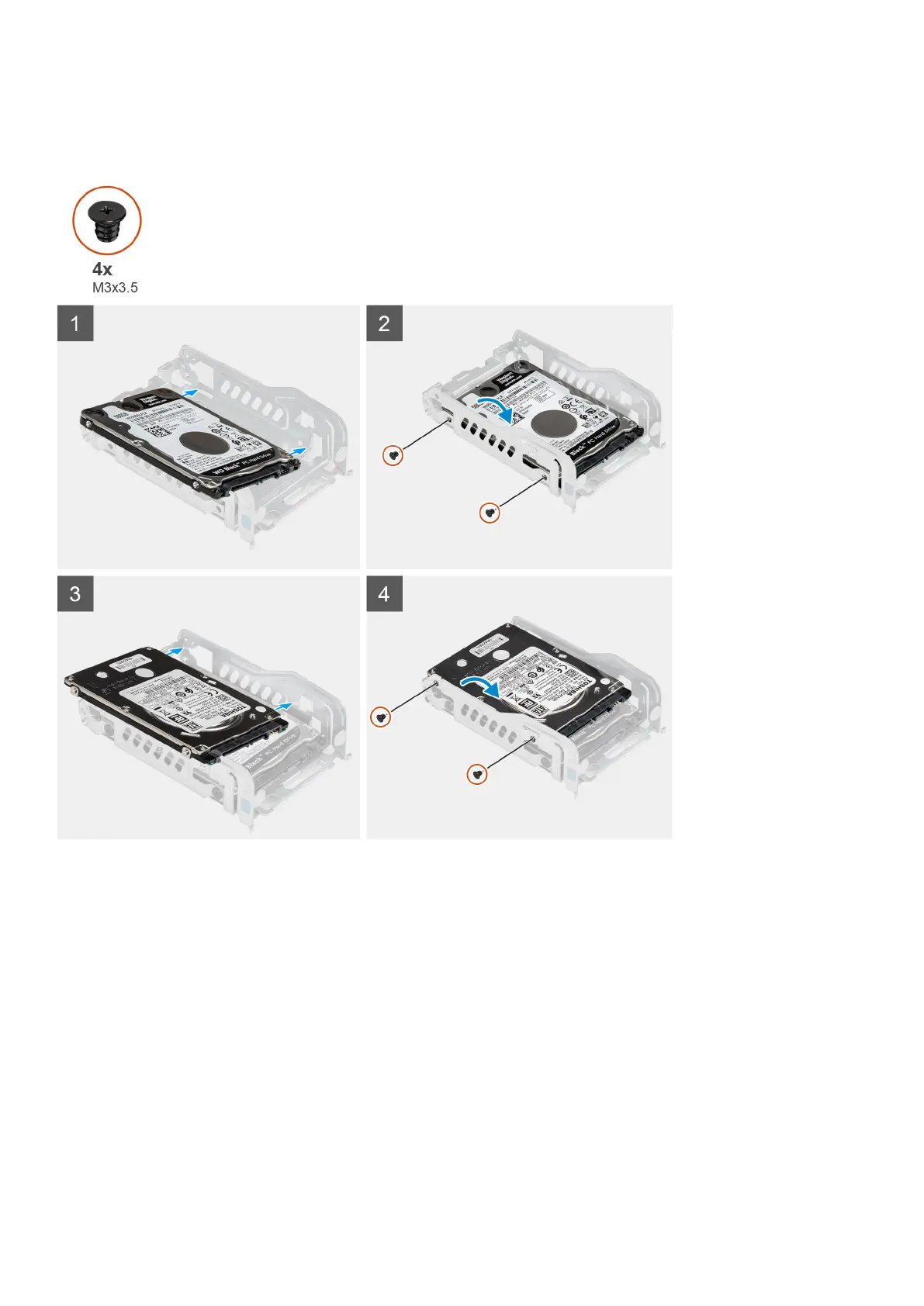 4. Replace the two (M3x3.5) screws to secure the first hard drive to the hard drive cage.