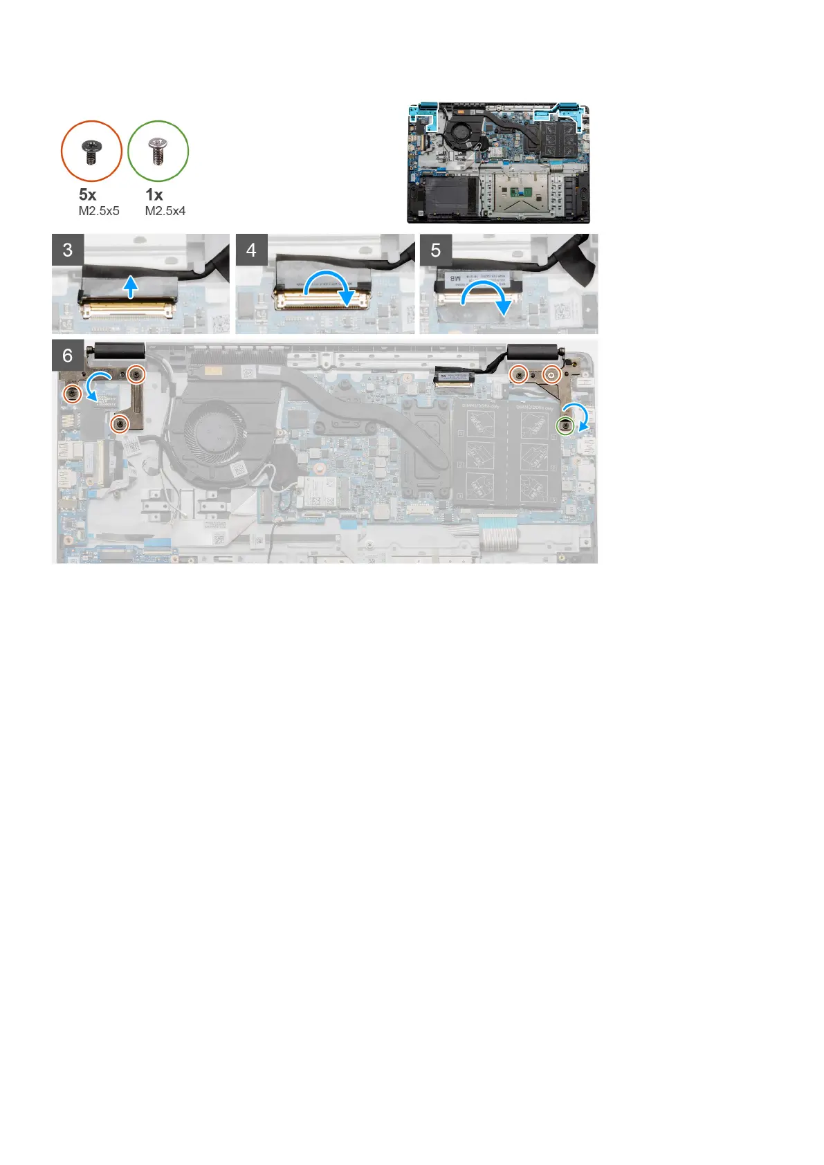 6. Install the six (M2.5x5) screws that secure the display hinges to the chassis of your computer.
