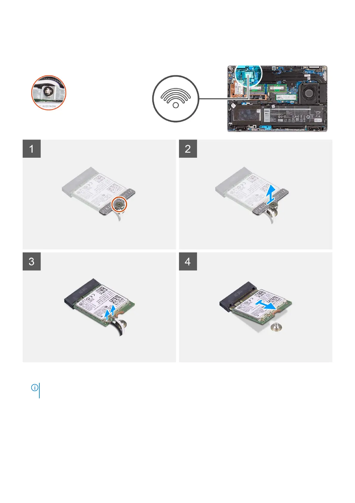 The following images indicate the location of the wireless card and provide a visual representation of the removal procedure.