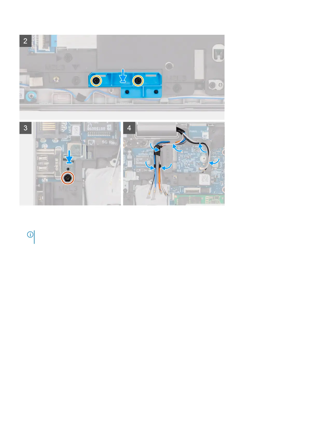 6. Route the antennas cable through the routing guides on the assembly inner frame.