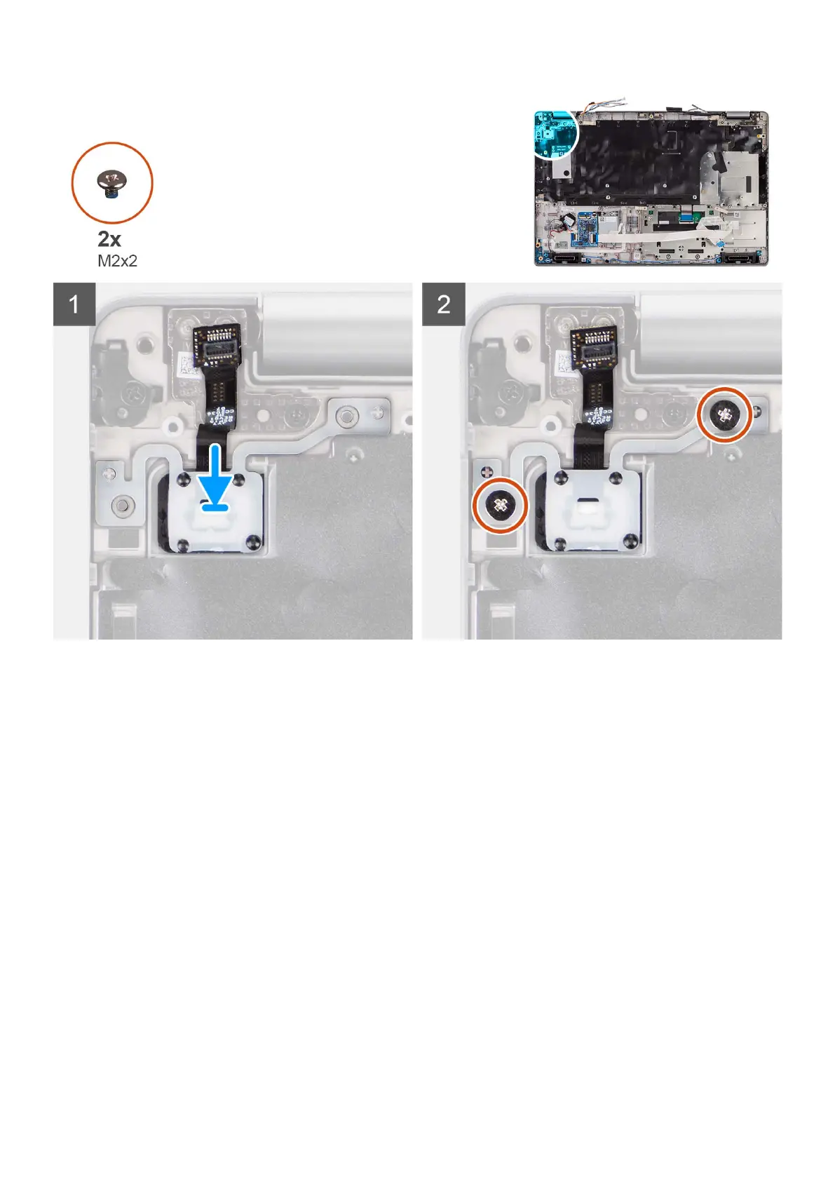 2. Replace the two screws (M2x2) that secure the power-button board to the palm-rest assembly.