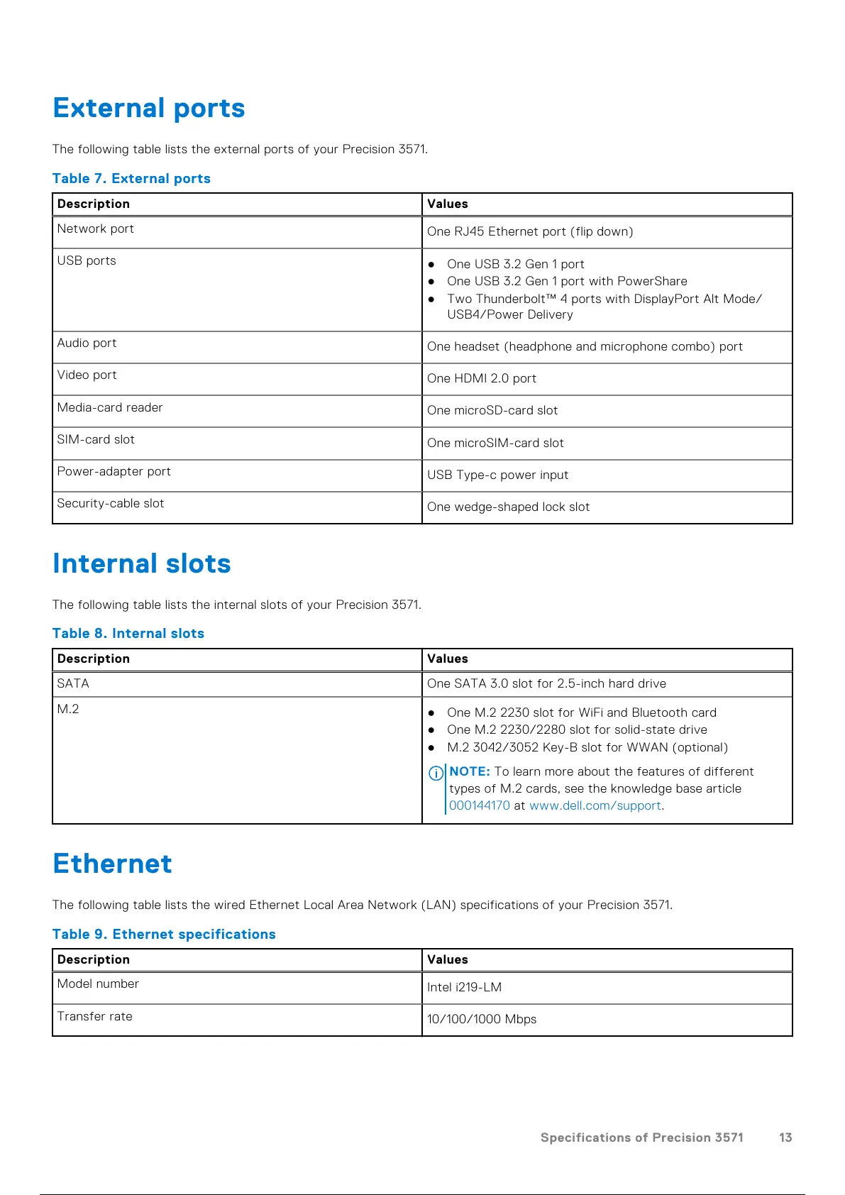 The following table lists the wired Ethernet Local Area Network (LAN) specifications of your Precision 3571.