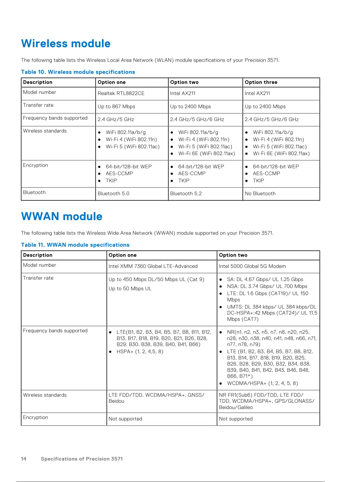 The following table lists the Wireless Local Area Network (WLAN) module specifications of your Precision 3571.