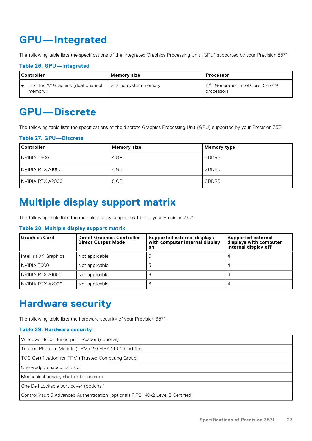 The following table lists the specifications of the integrated Graphics Processing Unit (GPU) supported by your Precision 3571.