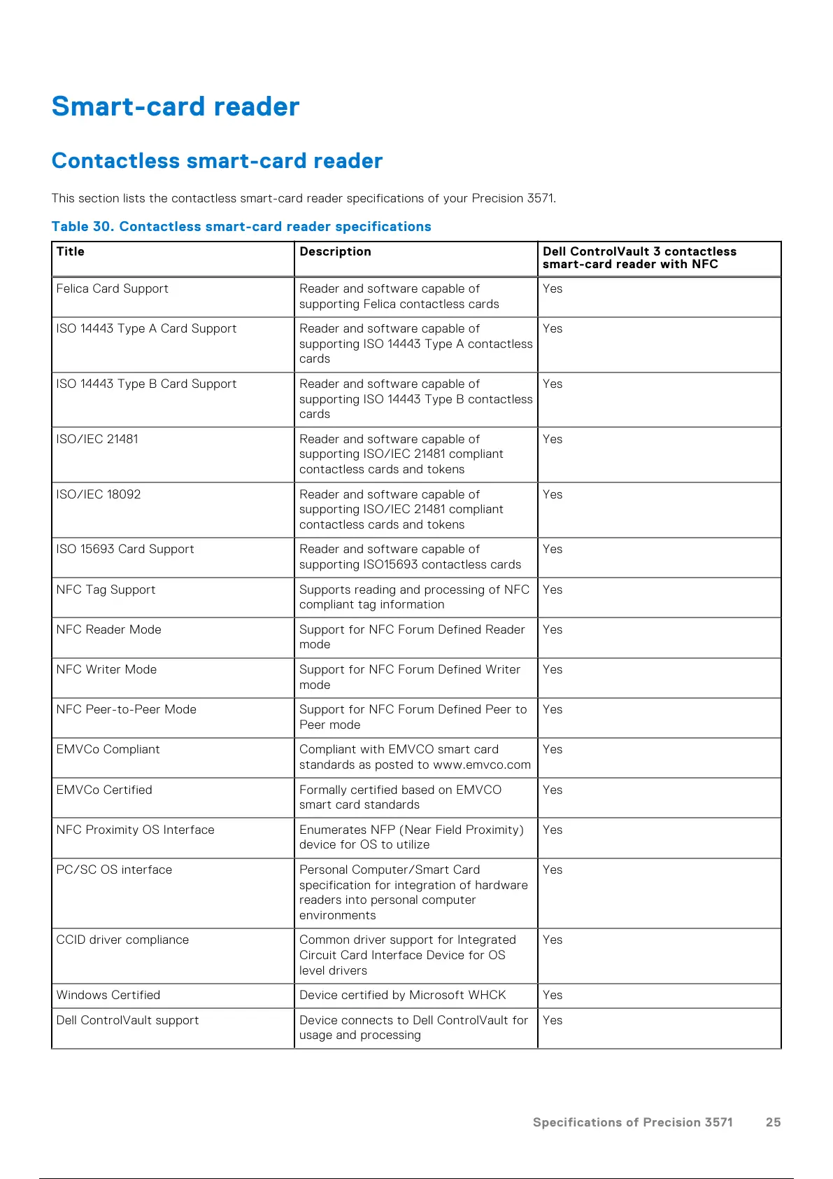 This section lists the contactless smart-card reader specifications of your Precision 3571.