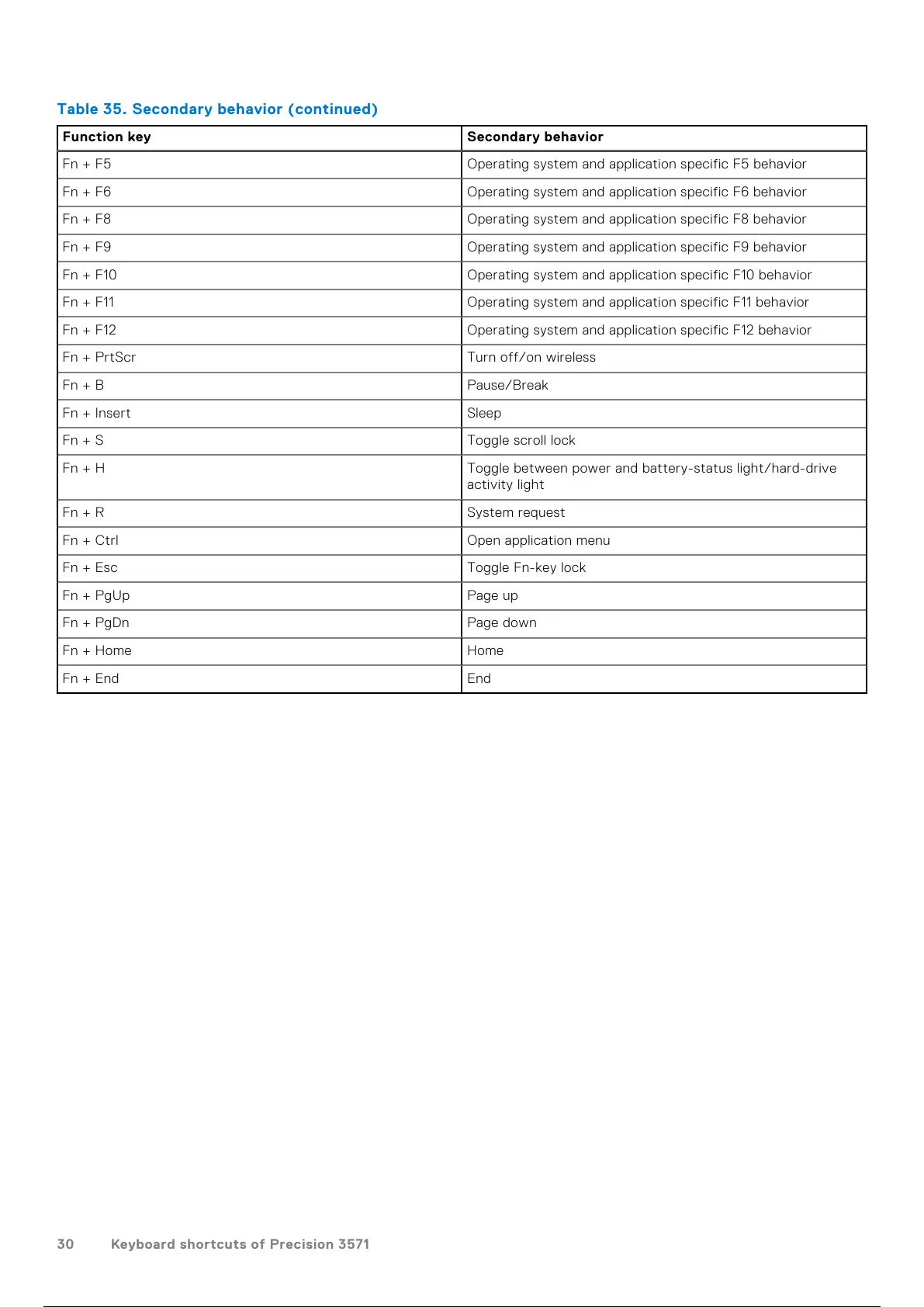 30 Keyboard shortcuts of Precision 3571