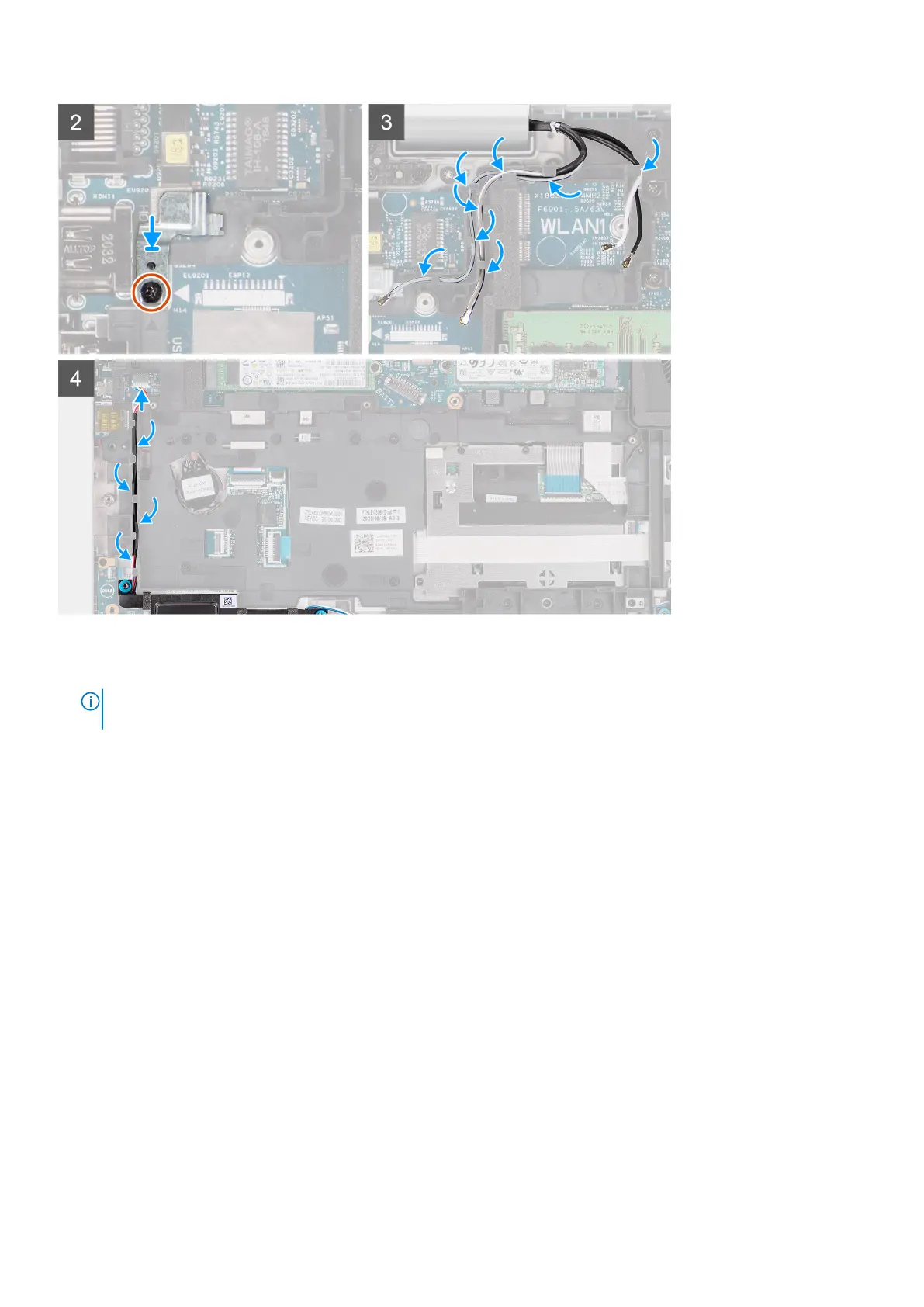 5. Route the antennas cable through the routing guide on the assembly inner frame.