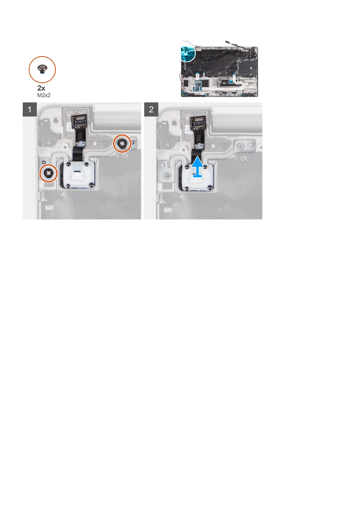 1. Remove the two screws (M2x2) that secure the power-button board to the palm-rest assembly.