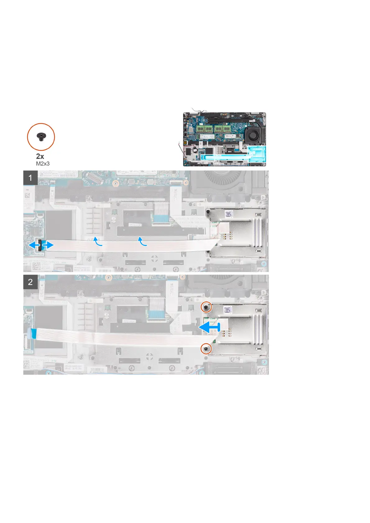 2. Remove the two screws (M2x3) that secure the smart card reader to the palm-rest assembly.