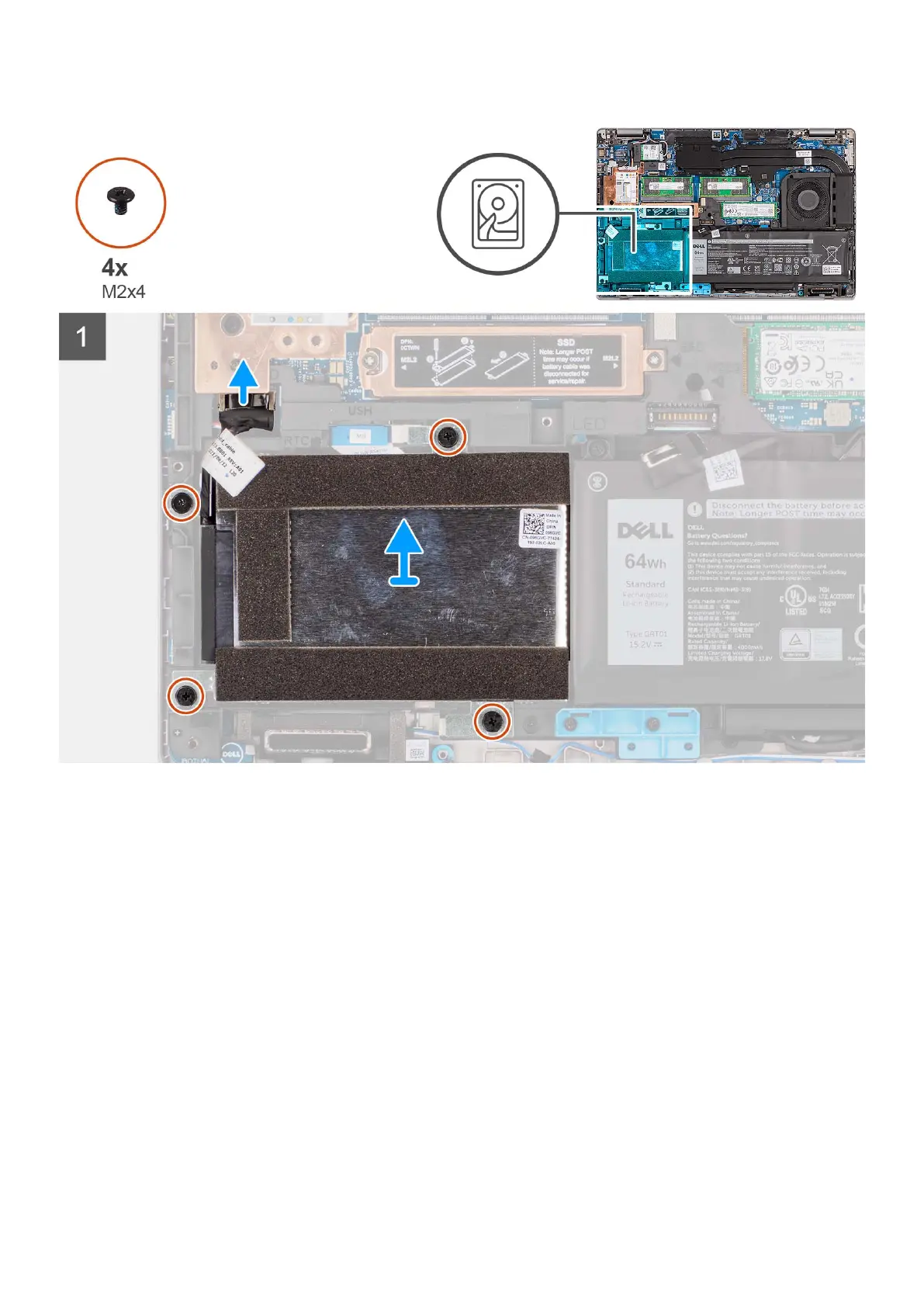 2. Remove the four screws (M2x4) that secure the hard drive to the palm-rest and keyboard assembly.