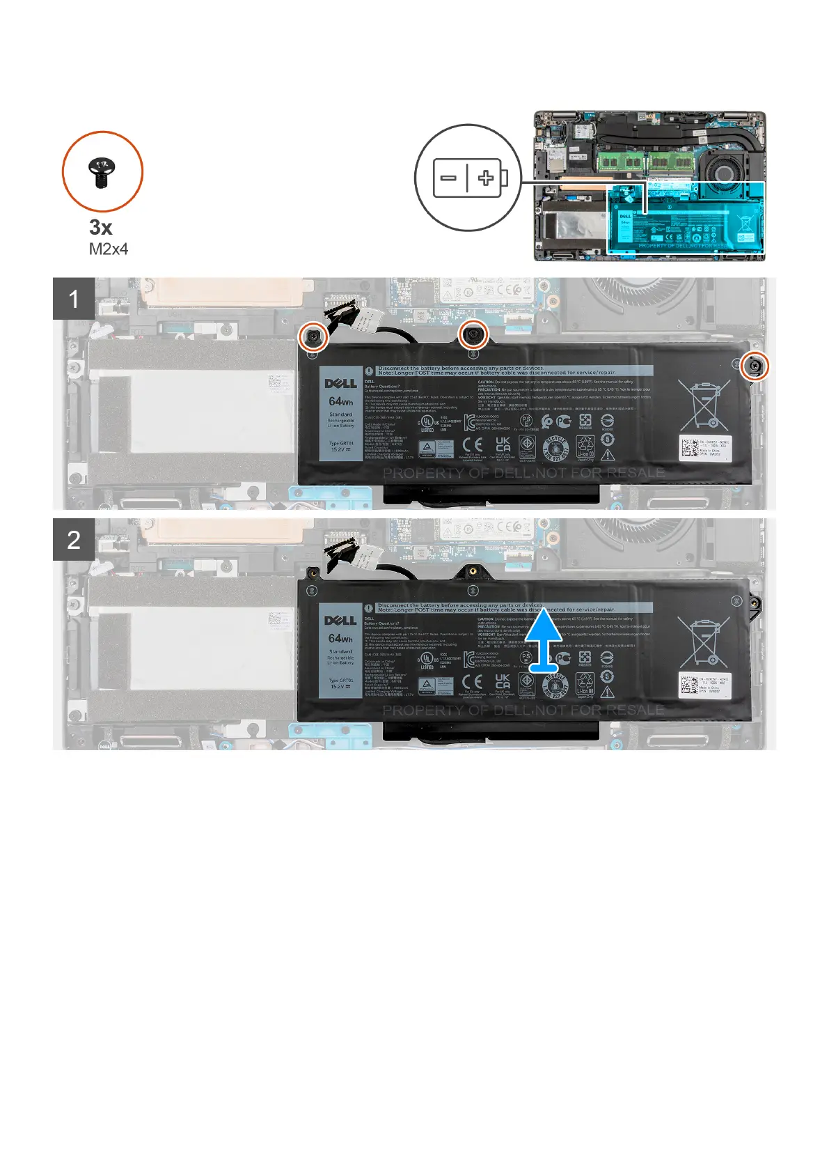 2. Remove the three screws (M2x4) that secure the 4-cell battery to the palm-rest and keyboard assembly.