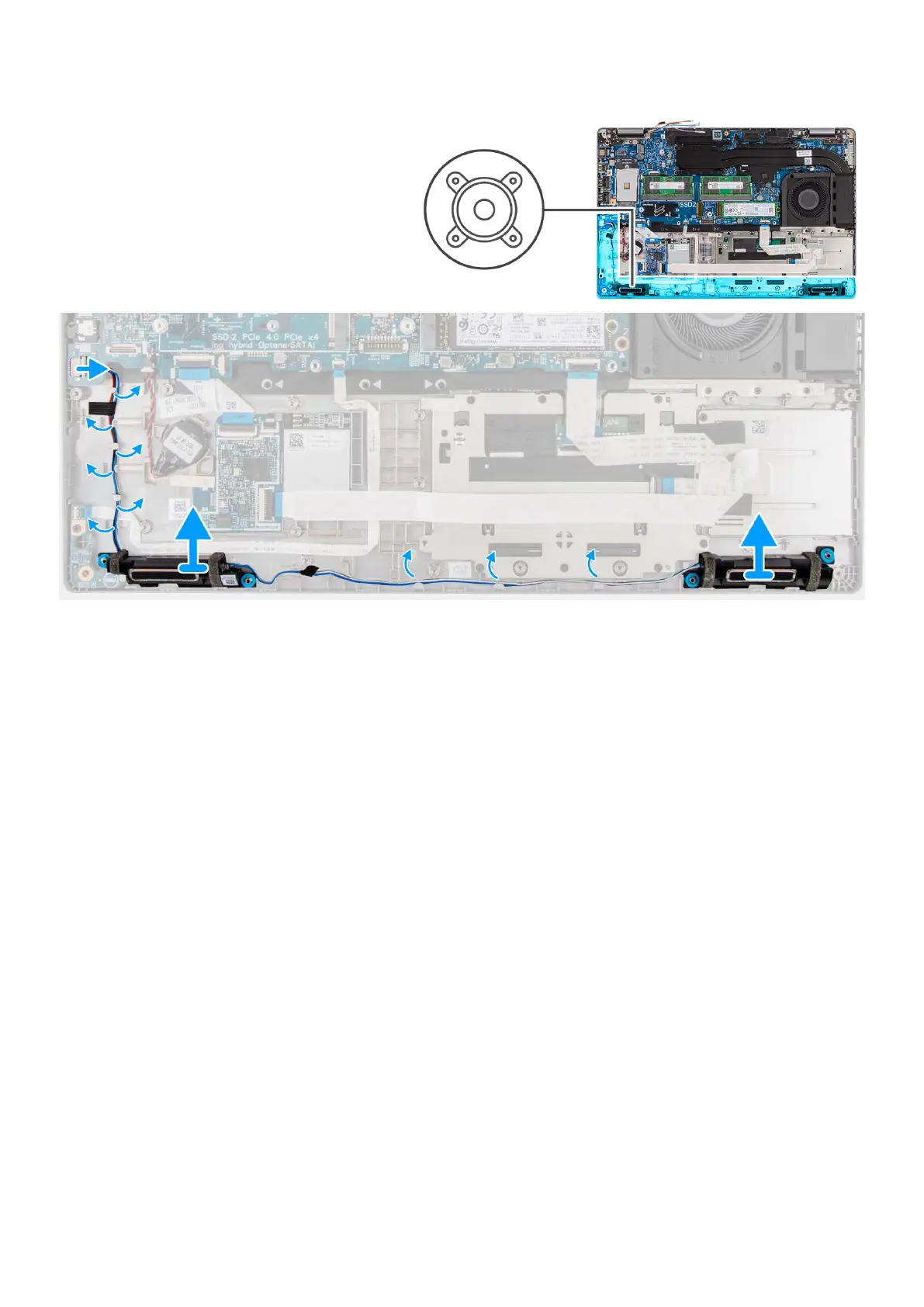 4. Lift the speakers, along with the cable, off the palm-rest and keyboard assembly.