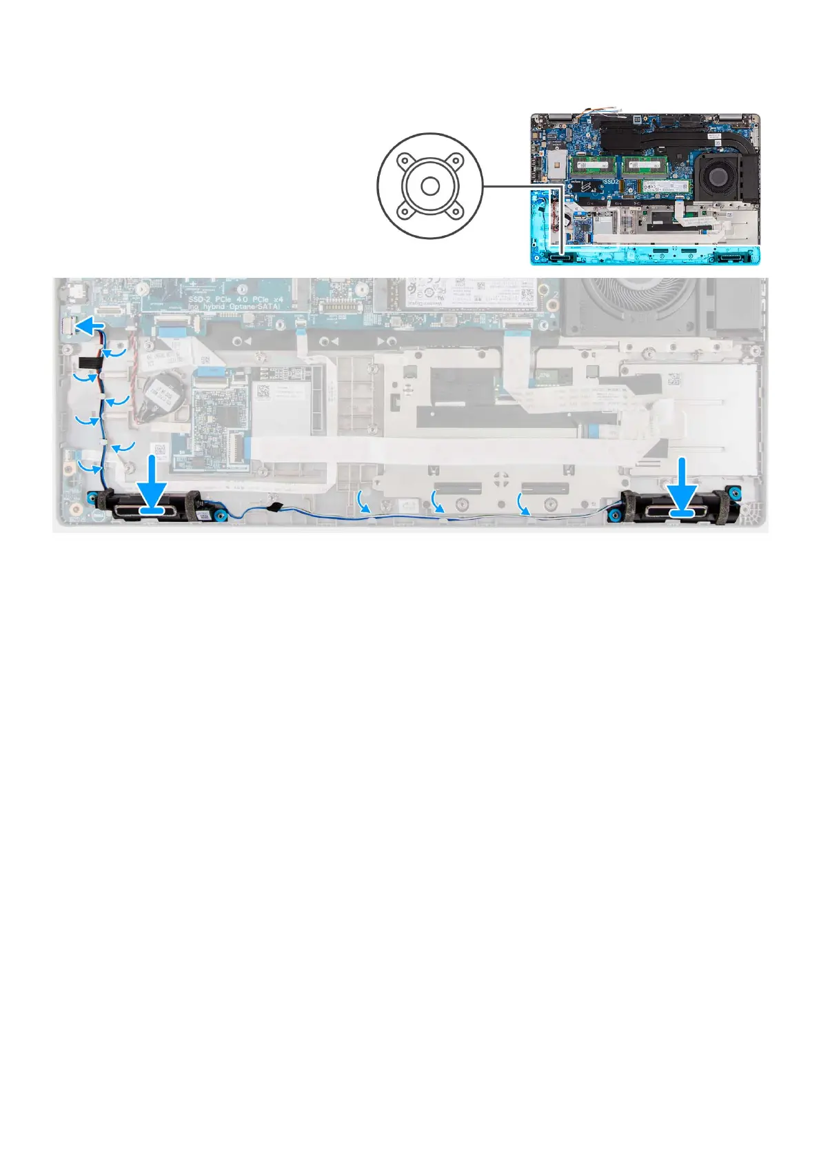1. Using the alignment posts and rubber grommets, place the speakers on the slots of the palm-rest and keyboard assembly.