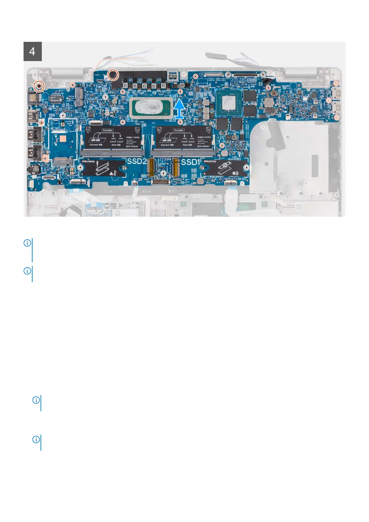 14. Remove the two screws (M2x3) that secure the system board to the palm-rest assembly and keyboard assembly.